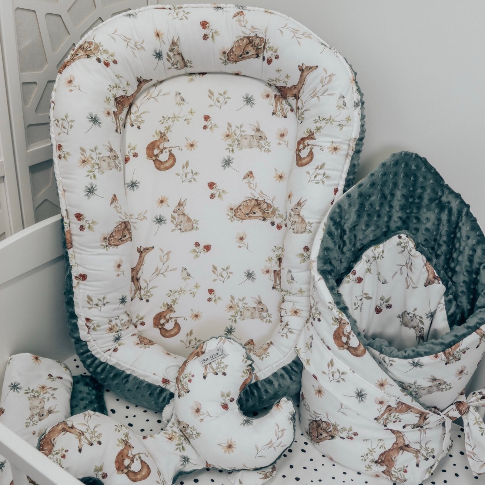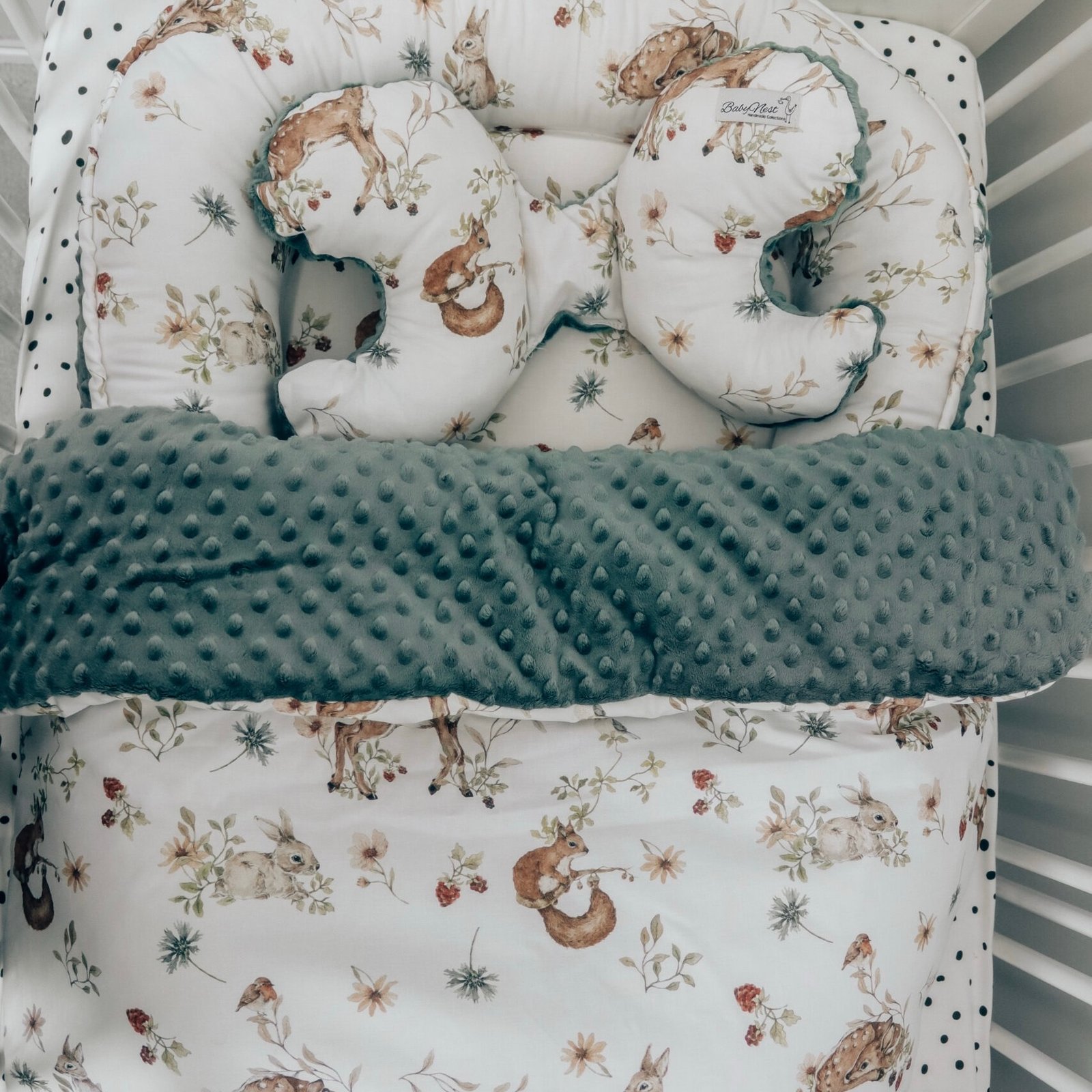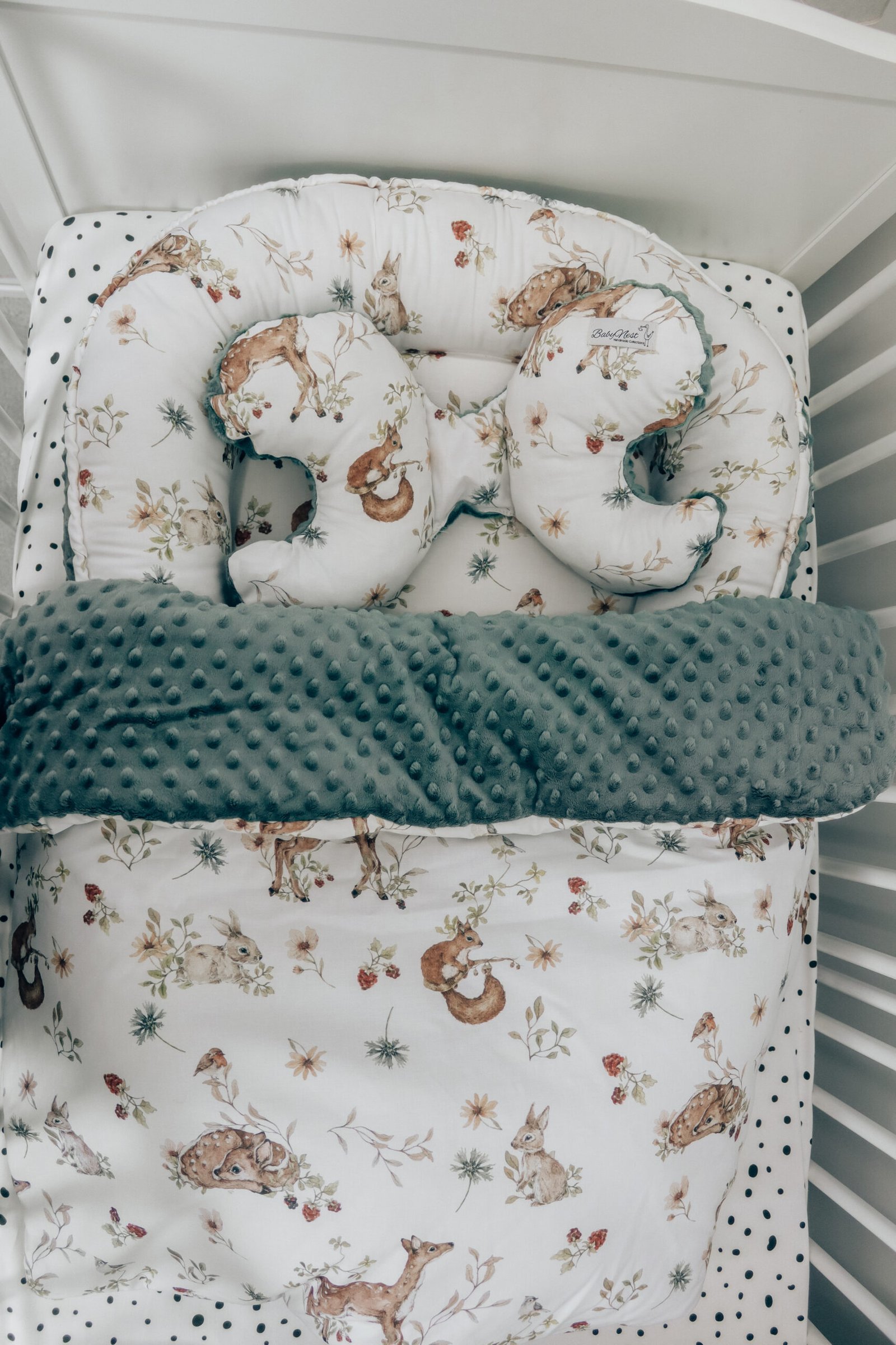 The unique baby nest envelops your baby from the first moment of birth. The baby rests in the warm and soft nest and feels safe and secure. It is made of 100% % hypoallergenic cotton. The nest can be adapted to the baby's age, simply undo the drawstring on the legs. It can be placed on any surface and used as a crib for your baby's first few months. The bumper is ideal for traveling or visiting friends, always providing safety and comfort for the baby.