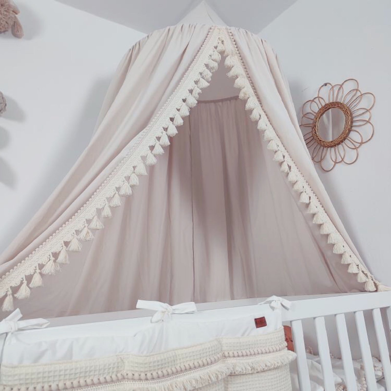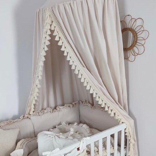 A fairytale canopy that creates an enchanting space decorates every baby bed, every child's bed, every cradle or even the play carpet in the children's room. Made of soft, very dense and beautiful Ökotex cotton. About 30 m of cotton were used for the canopy. Manufactured with great attention to detail. Ring Diameter 60 cm Height 240 cm 100% Cotton with OEKO-TEX® certificate. care instructions