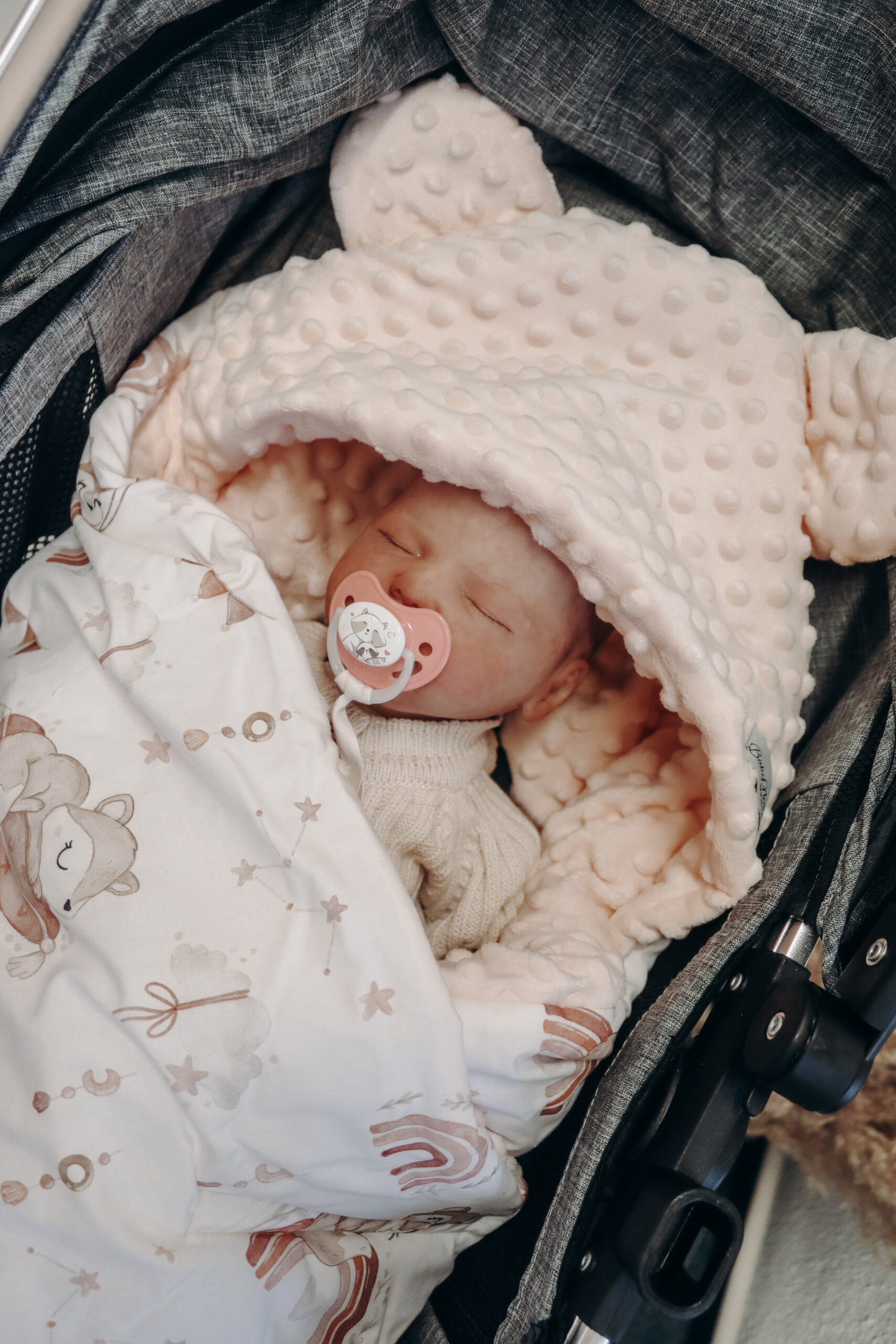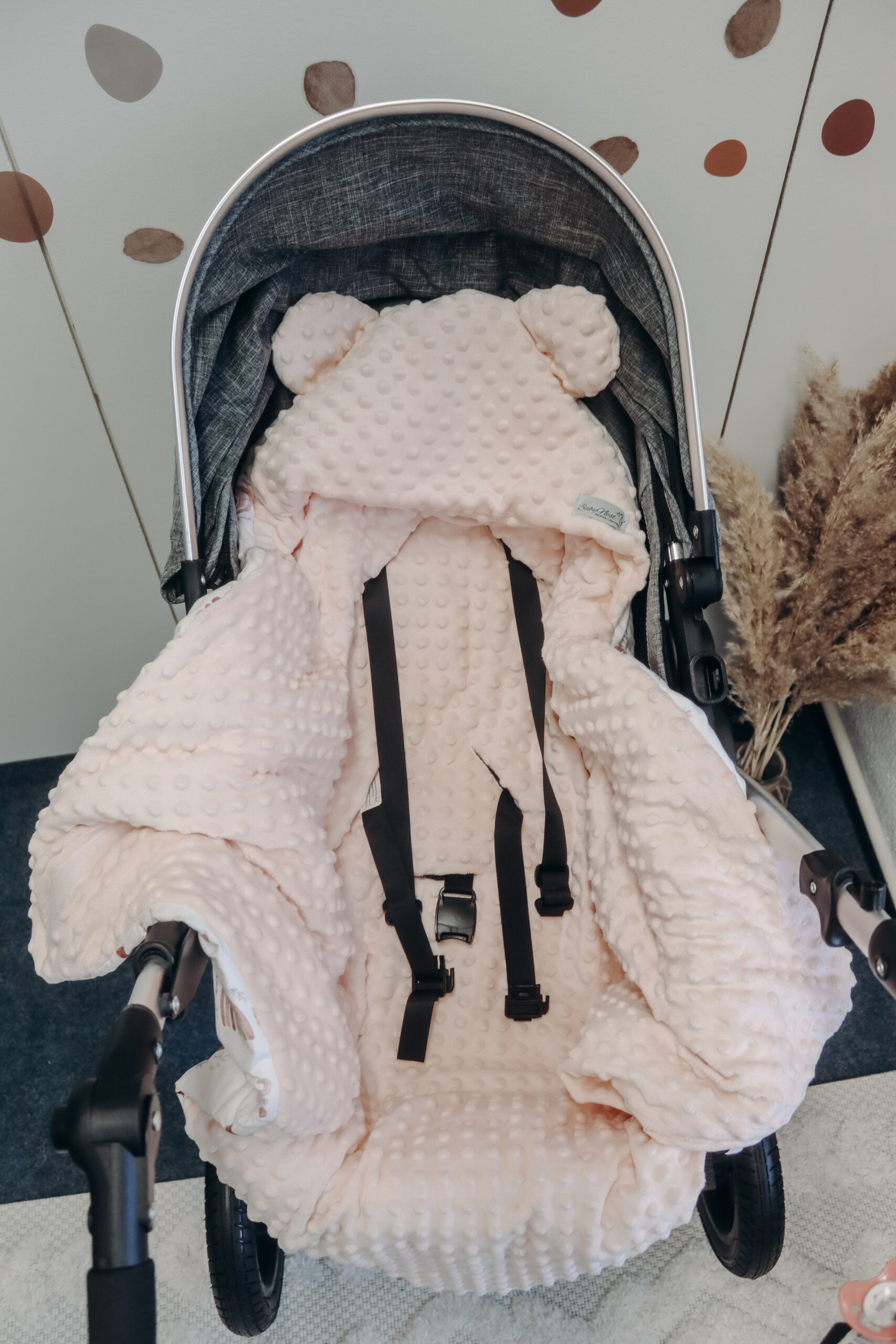 Cozy car seat blanket for the stroller or car seat made from 100% Oeko-Tex Standard cotton fabric and Minky Velvet. You can use this to wrap your baby on small and large trips and it will give him a feeling of warmth and security. The comfortable hood covers the baby's head and also covers the sensitive ears if necessary. The blanket has safety belt holes so it stays in the car seat when the baby is pulled out.