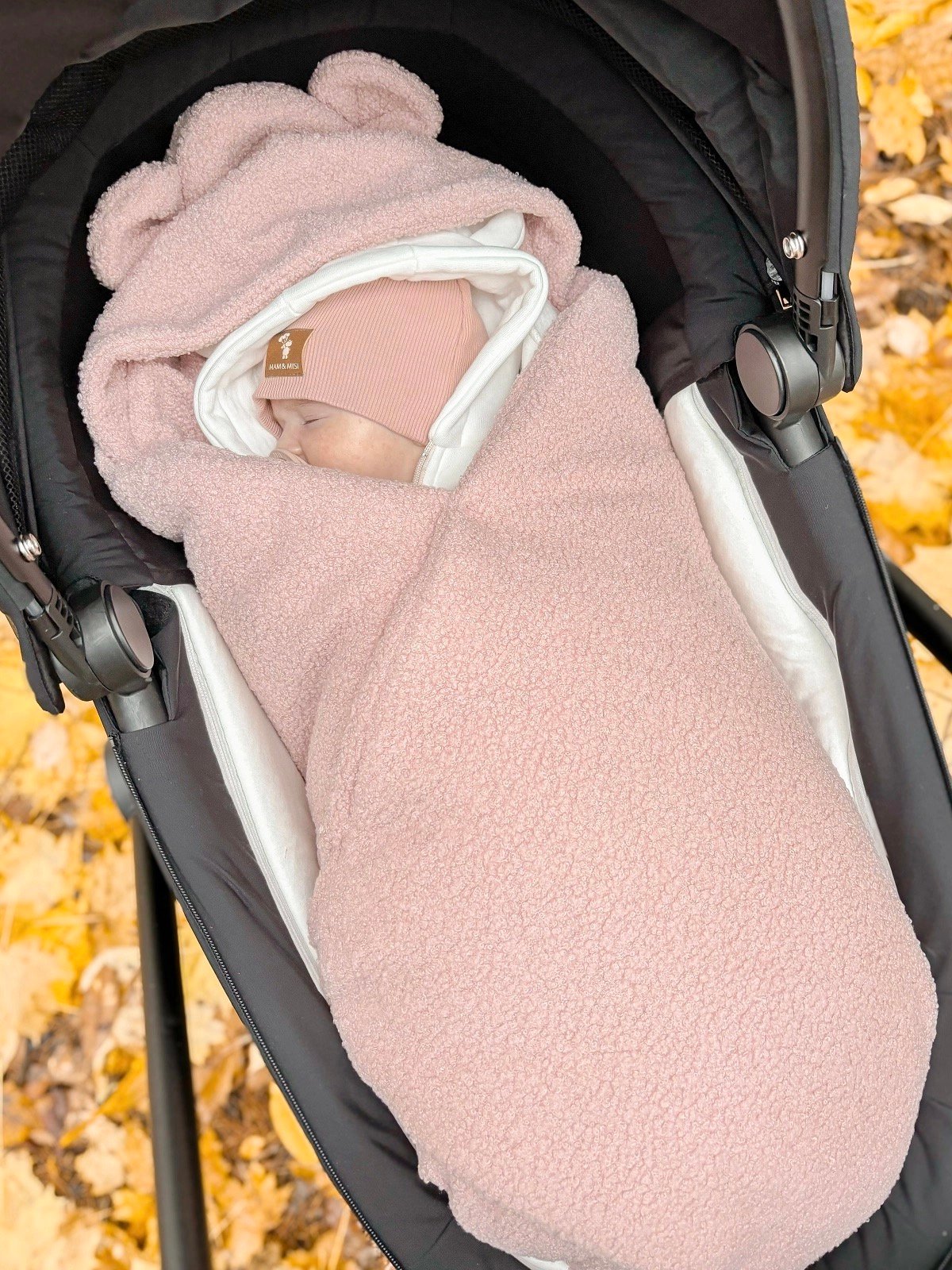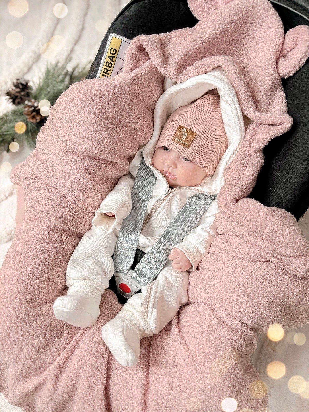 Cozy car seat blanket for strollers or car seats made from 100% Oeko-Tex Standard teddy fabric. Wrap your baby in it for short and long outings, giving them a feeling of warmth and security. The comfortable hood covers the baby's head and, if needed, their sensitive ears. The blanket has holes for the safety harness, so it stays in the car seat when the baby is taken out. The entire BabyNest collection is made from 100% Oeko-Tex certified cotton, tested for harmful substances. Suitable for sensitive baby skin. Made in the EU.