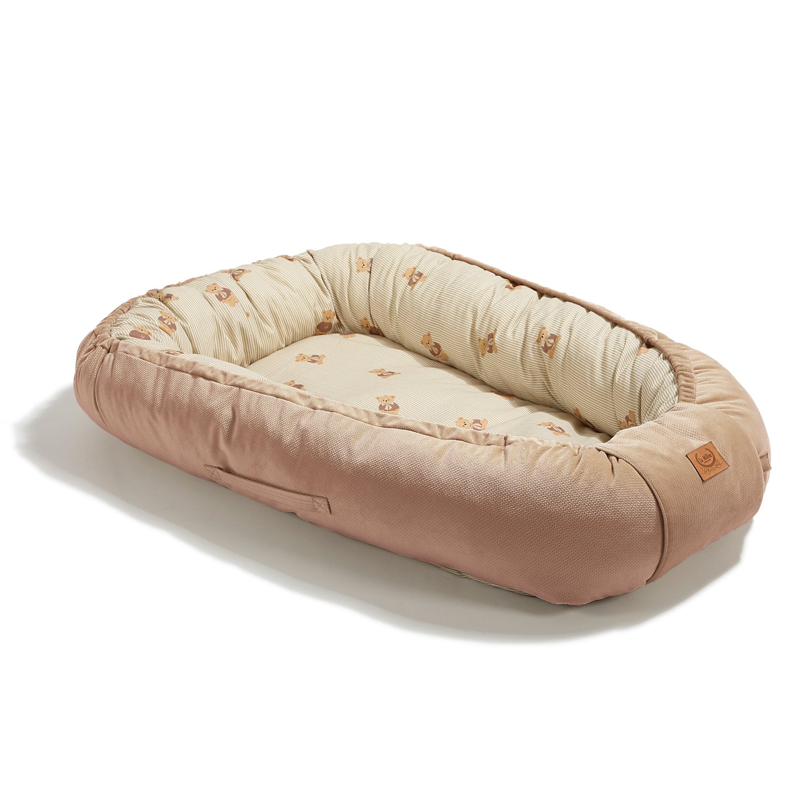 Das Babynestchen Baby Bear von La Millou ist ein multifunktionales Produkt, das speziell für Kinder entwickelt wurde, um einen eigenen und sicheren Platz zum Spielen, Schlafen und Ausruhen zu bieten. Es ermöglicht Eltern, ihr Baby bei verschiedenen Aktivitäten zu begleiten, sei es bei der Arbeit, auf dem Sofa, beim Baden oder im Freien. Das Nestchen eignet sich auch ideal für Reisen, da es dem Baby in neuen Umgebungen einen vertrauten Raum bietet. Die Innenseite und der Boden bestehen aus luftiger Baumwolle, die äussere Seite aus weichem und luftdurchlässigem Samt. Die Ränder sind mit antiallergischer Silikonfüllung versehen.