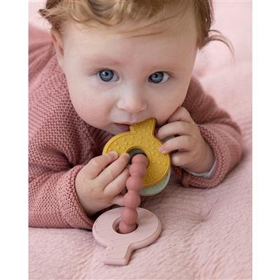When the first teeth come through, it's a milestone for your baby, but it's not always pleasant! To ease the pain, Little Dutch has designed a multifunctional teething toy in the shape of a keychain. It's a toy, but it also provides comfort and helps with teething. The teething toy features different textures, giving your baby plenty to explore. It's specially designed to be easy for baby hands to grasp!