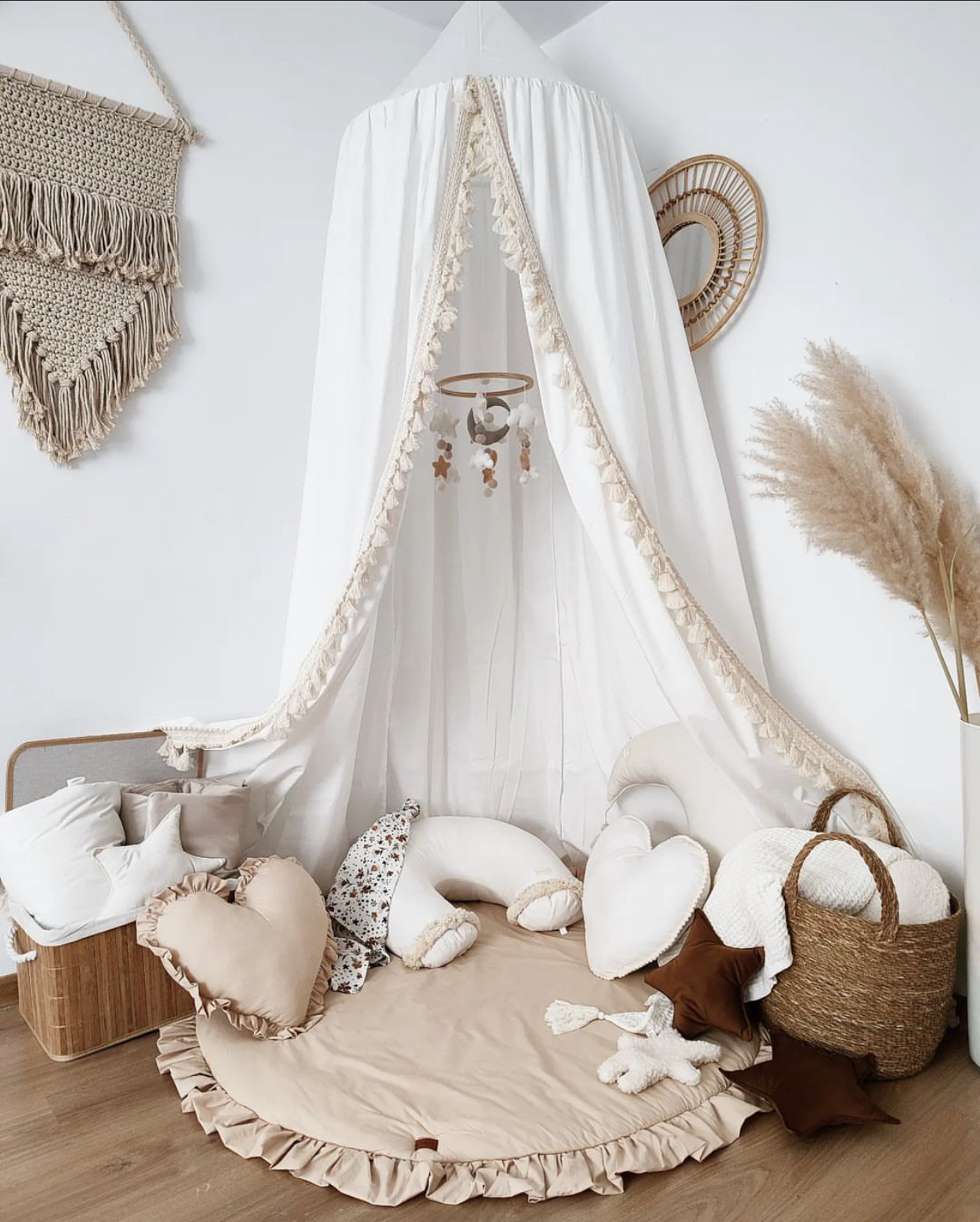 This boho-design velvet nursing pillow accompanies you when breastfeeding and later supports your child when sleeping as a pillow.