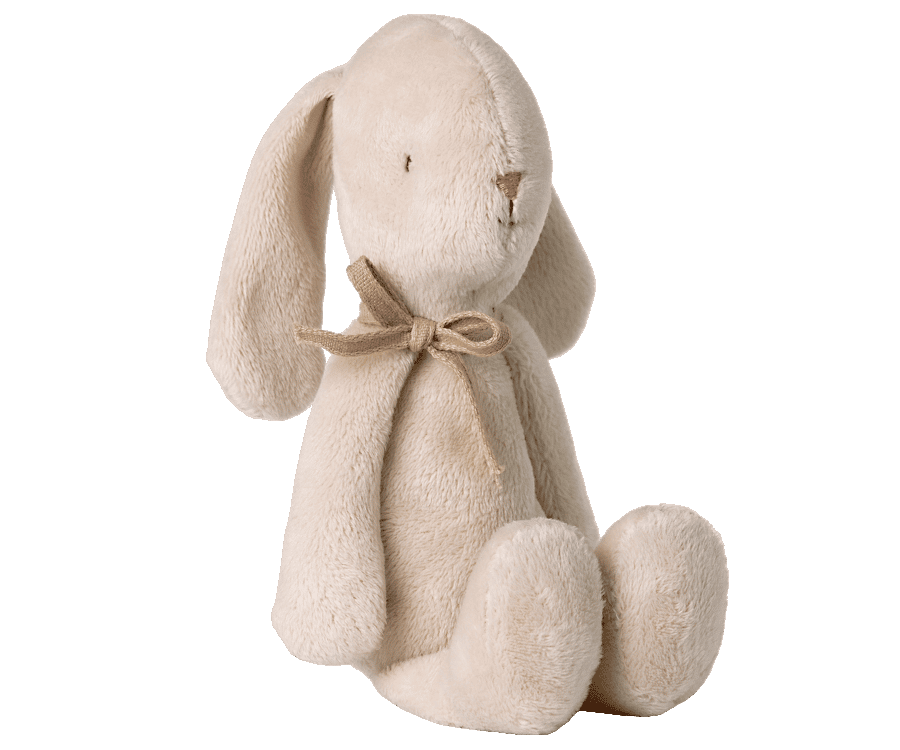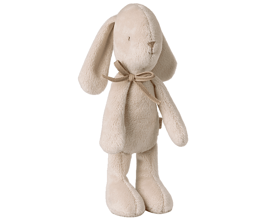A little soft bunny is perfectly made for little hands. He is made of plush and has a colored bow around his neck. This is the perfect baby shower gift or a "welcome to the world" gift.