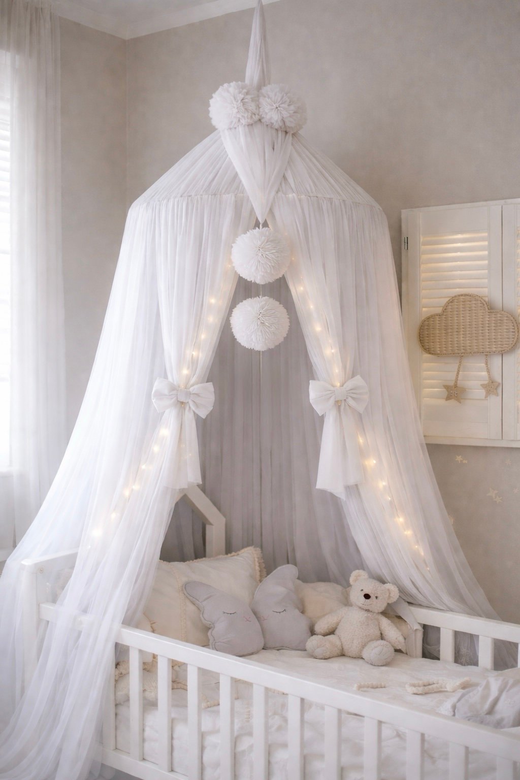 Remarque : Le ciel de lit en tulle blanc provient d'un fabricant européen. Fabriqué avec une grande attention aux détails. Pompons faits à la main d'un diamètre d'environ 20 cm.