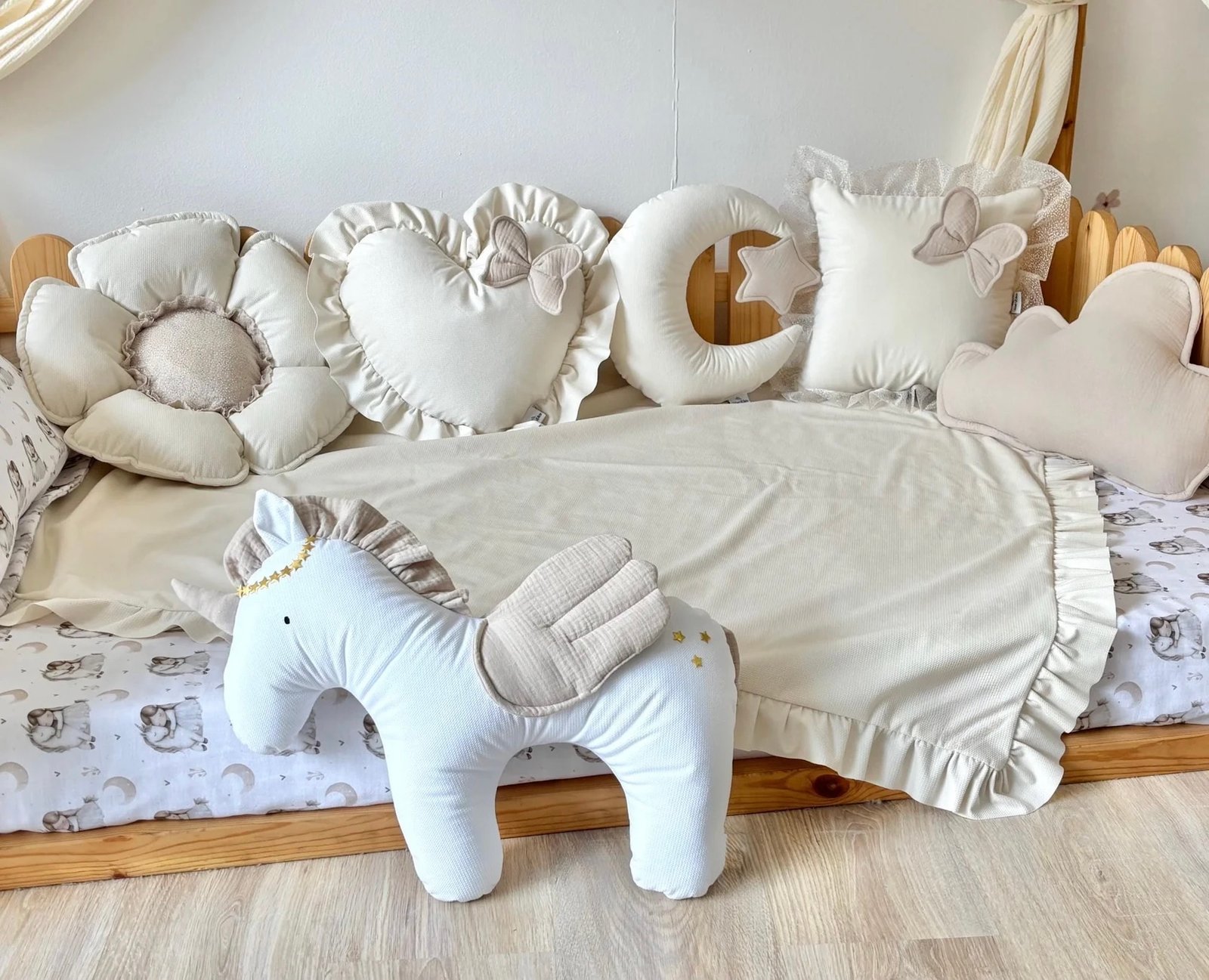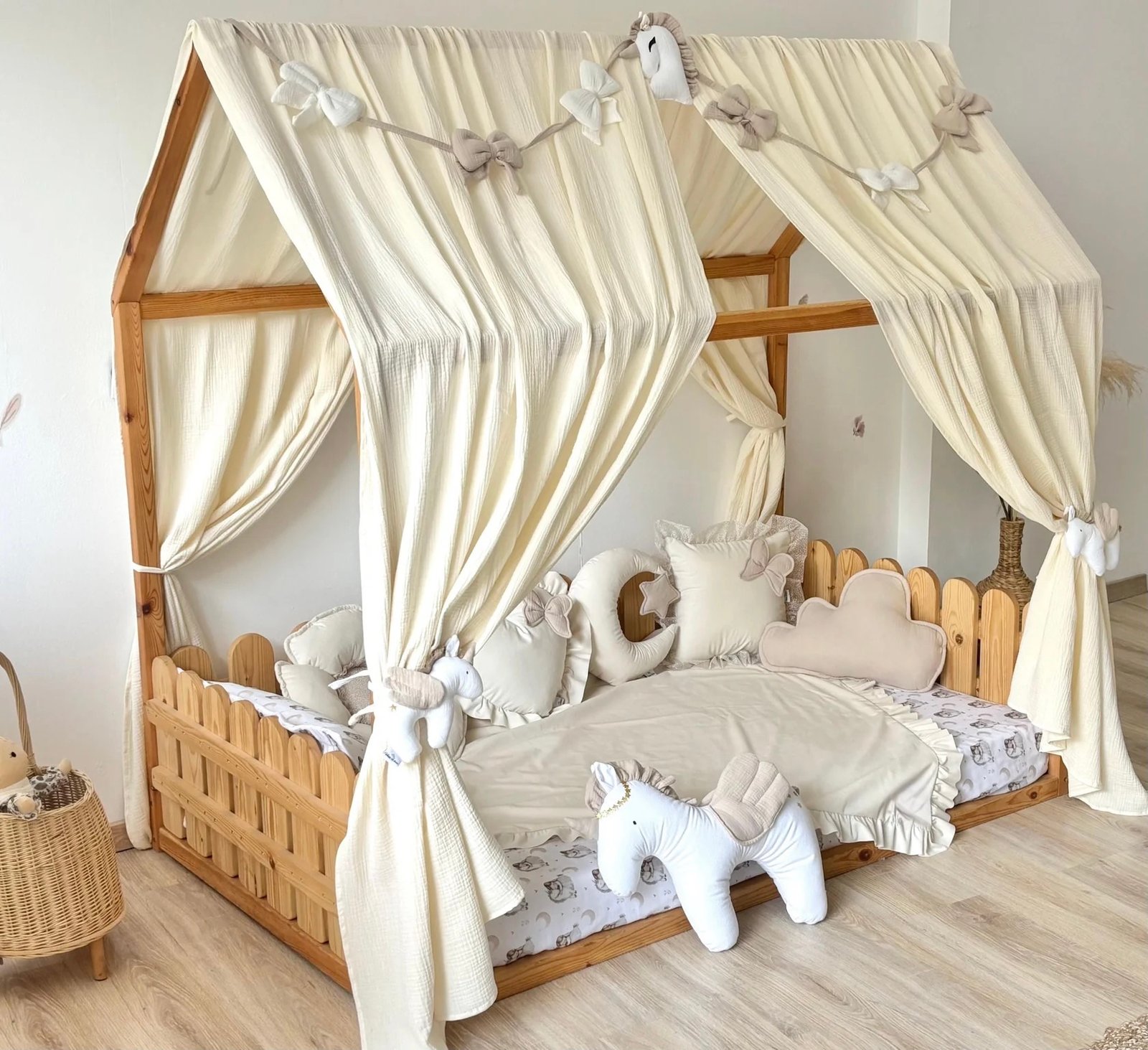 Cet élégant ensemble de décoration pour lit bébé, couleur crème douce, apporte une ambiance apaisante, naturelle et raffinée à la chambre de votre enfant. Le ciel de lit aérien, la guirlande harmonieuse et les coussins confectionnés avec soin créent une atmosphère chaleureuse et accueillante, idéale pour les intérieurs modernes, minimalistes et d'inspiration Montessori.