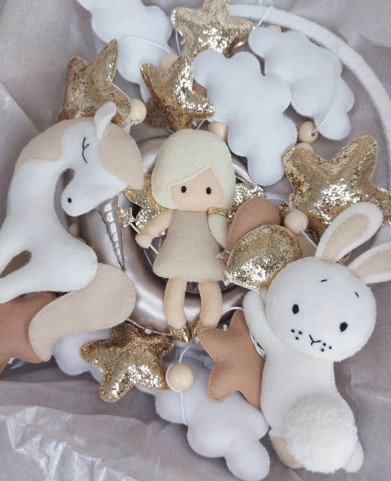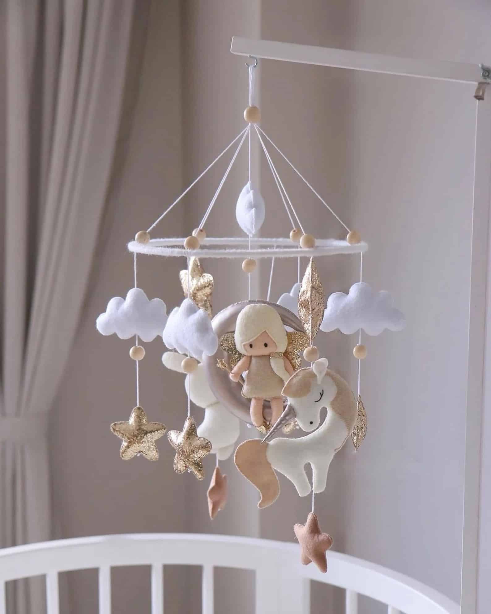 Le meilleur mobile bébé fille, une superbe décoration pour la chambre des enfants. Un mobile unique en feutre fait à la main pour votre nouveau-né qui stimule le développement visuel et aide bébé à s'endormir.