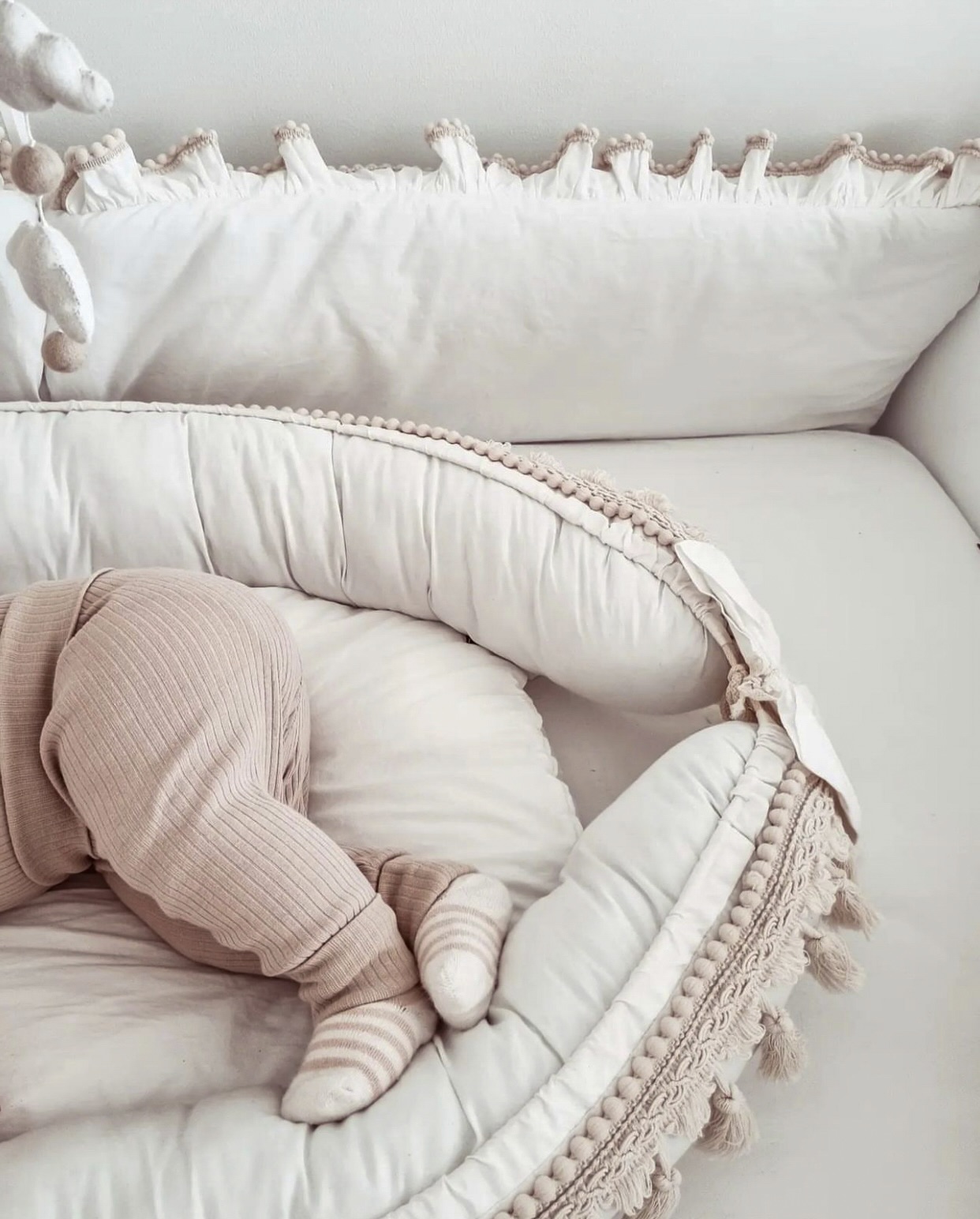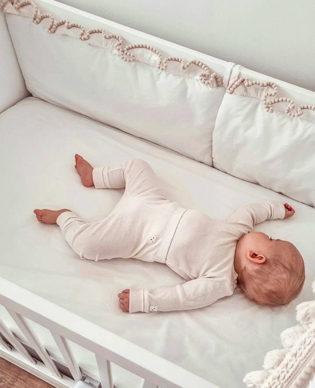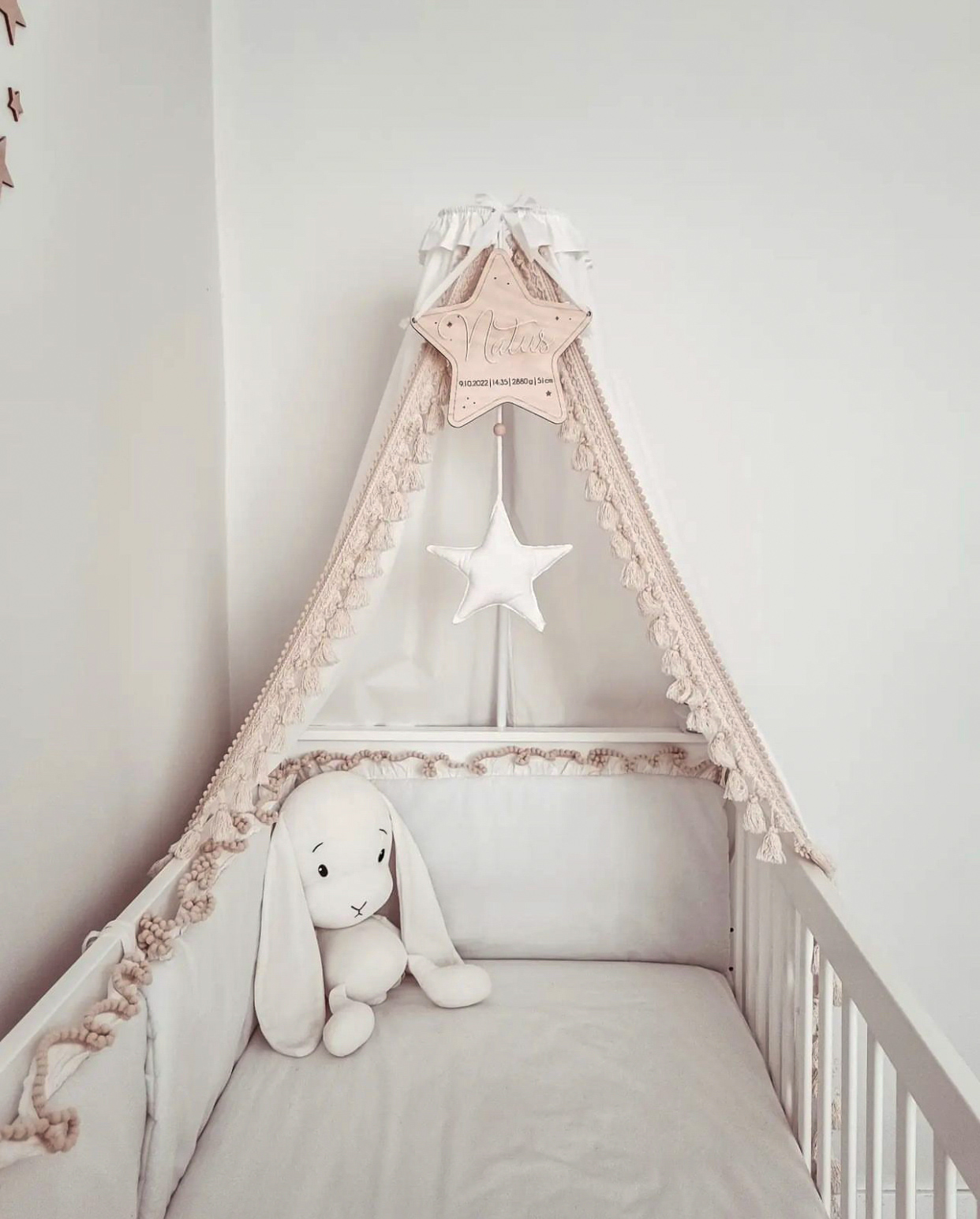 Ogni bambino merita un giroletto elegante e delicato. La nostra gonna da letto è realizzata interamente in cotone di alta qualità ed è decorata con giocosi pompon. Questo bordo progettato con cura non solo crea un'atmosfera accogliente, ma offre anche lo sfondo perfetto per un sonno tranquillo del bambino.