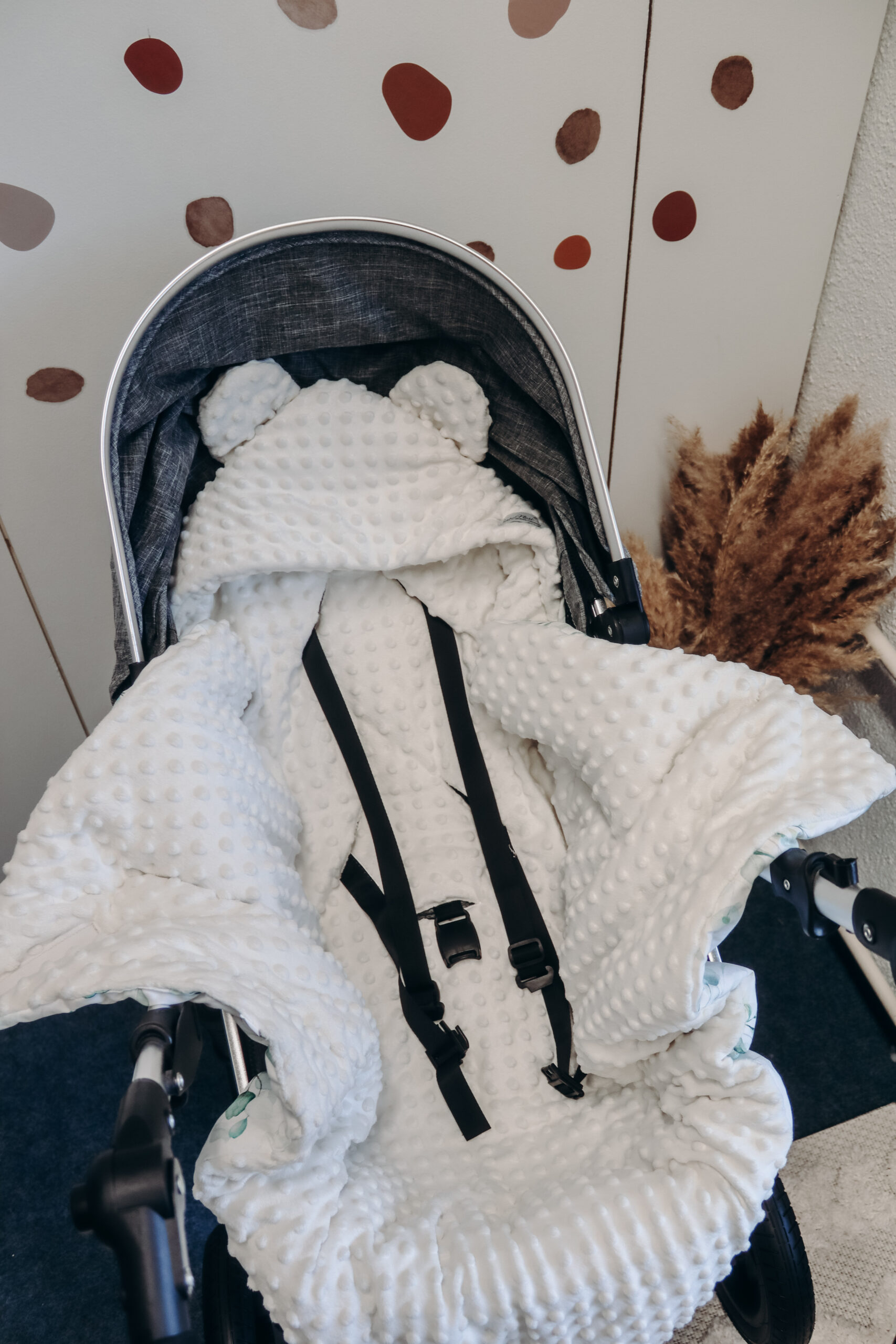 Kuschelige Autoschale Decke für den Kinderwagen oder Autositz aus 100% Öko-Tex Standard Baumwollstoff und Minky Velvet. Damit kannst du dein Baby bei kleinen und grossen Ausflügen einwickeln und es gibt ihm ein Gefühl von Wärme und Geborgenheit. Die bequeme Kapuze bedeckt den Kopf des Babys und deckt bei Bedarf auch die empfindlichen Ohren ab. Die Decke hat Löcher für den Sicherheitsgurt, so dass sie im Autositz bleibt, wenn das Baby herausgezogen wird.