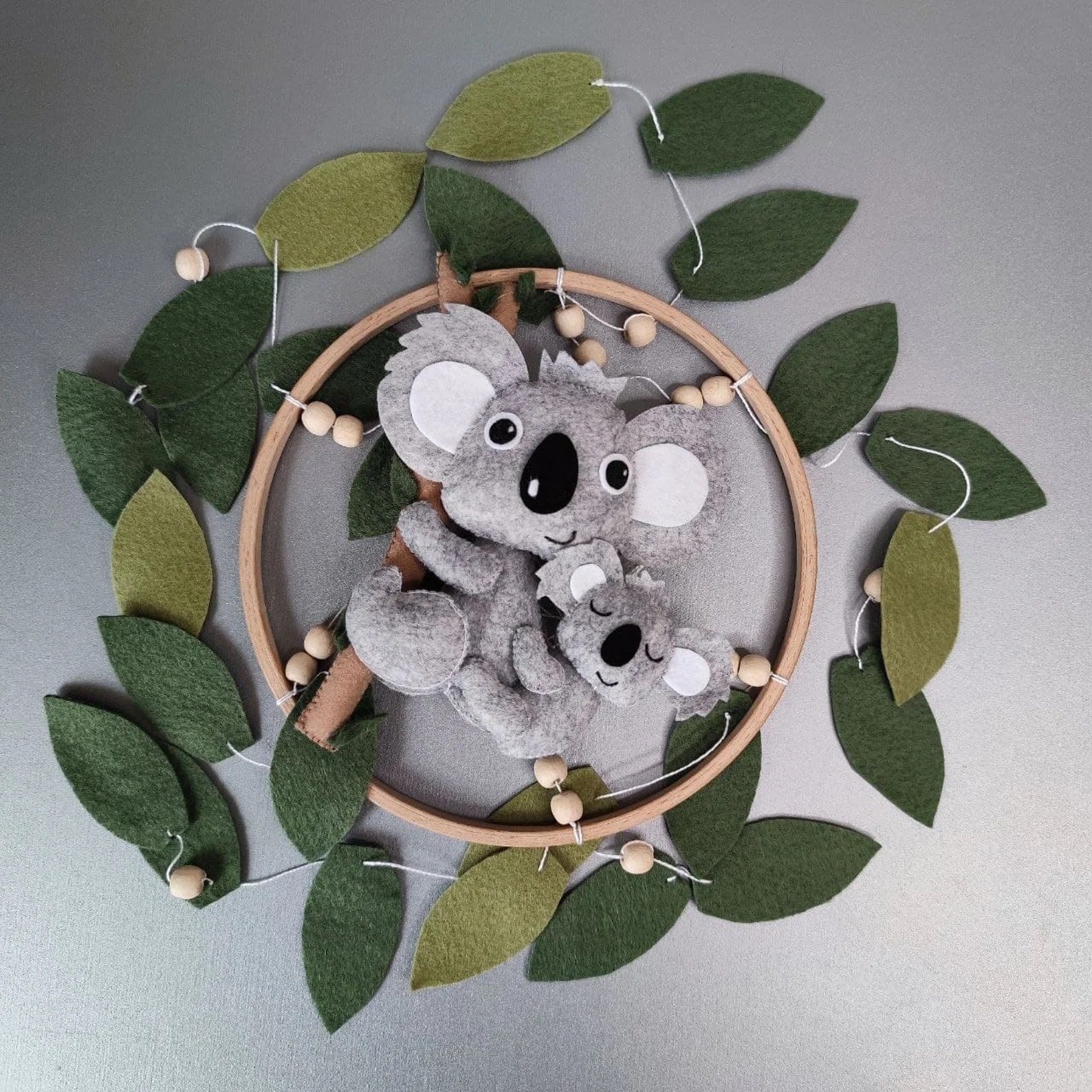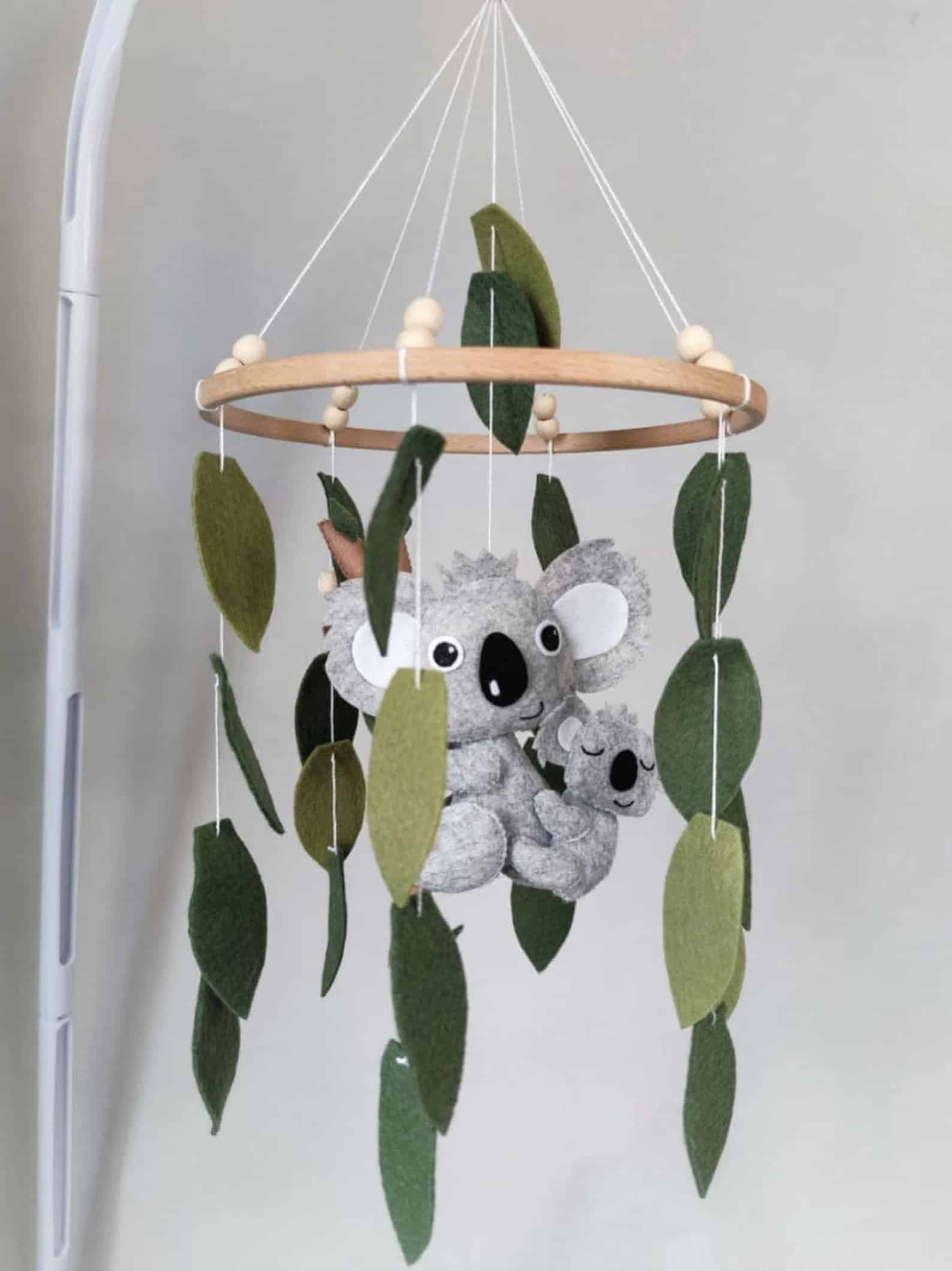 Das beste Koala Babymobile, eine tolle Dekoration für das Kinderzimmer. Ein einzigartiges, handgefertigtes Filz-Mobile für Ihr Neugeborenes, das die visuelle Entwicklung anregt und dem Baby hilft, sich selbst in den Schlaf zu wiegen.