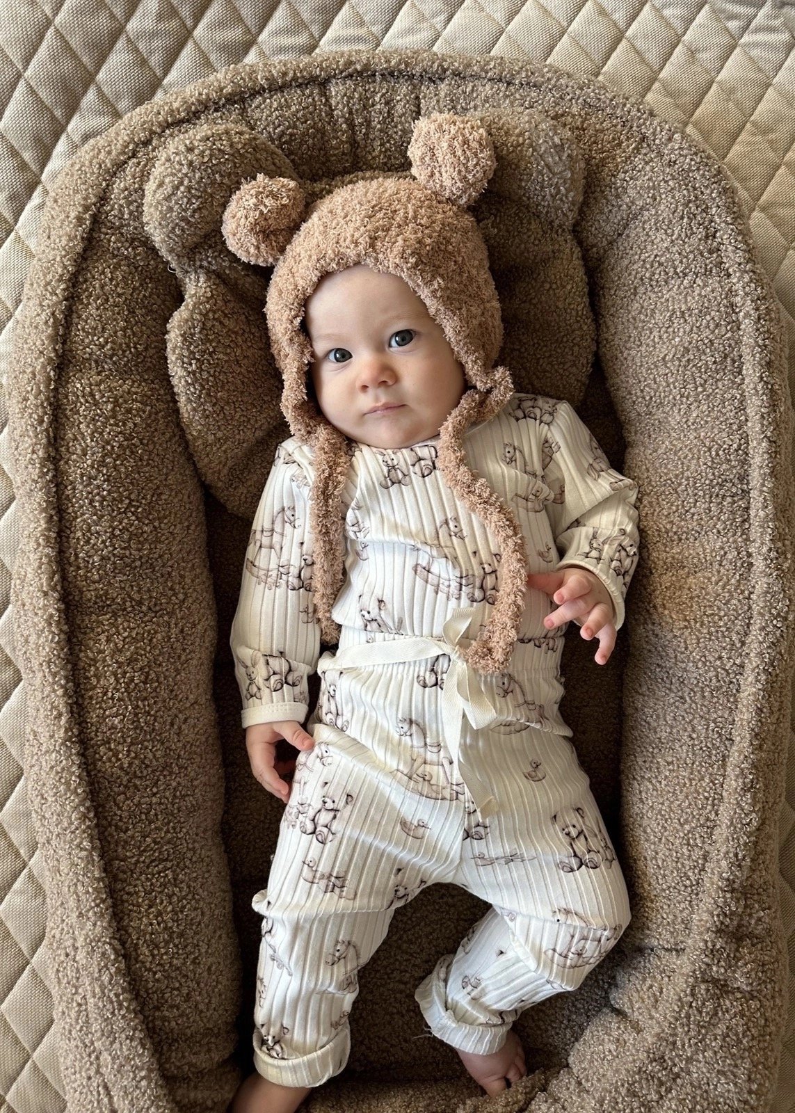 Der Stoff ist warm, weich und hat eine charakteristische, gekraeuselte Oberflaeche, die an echtes Teddypelz erinnert. Er wirkt behaglich und bietet ein angenehm weiches, geschuetztes Gefuehl – ideal fuer die zarte Babyhaut.