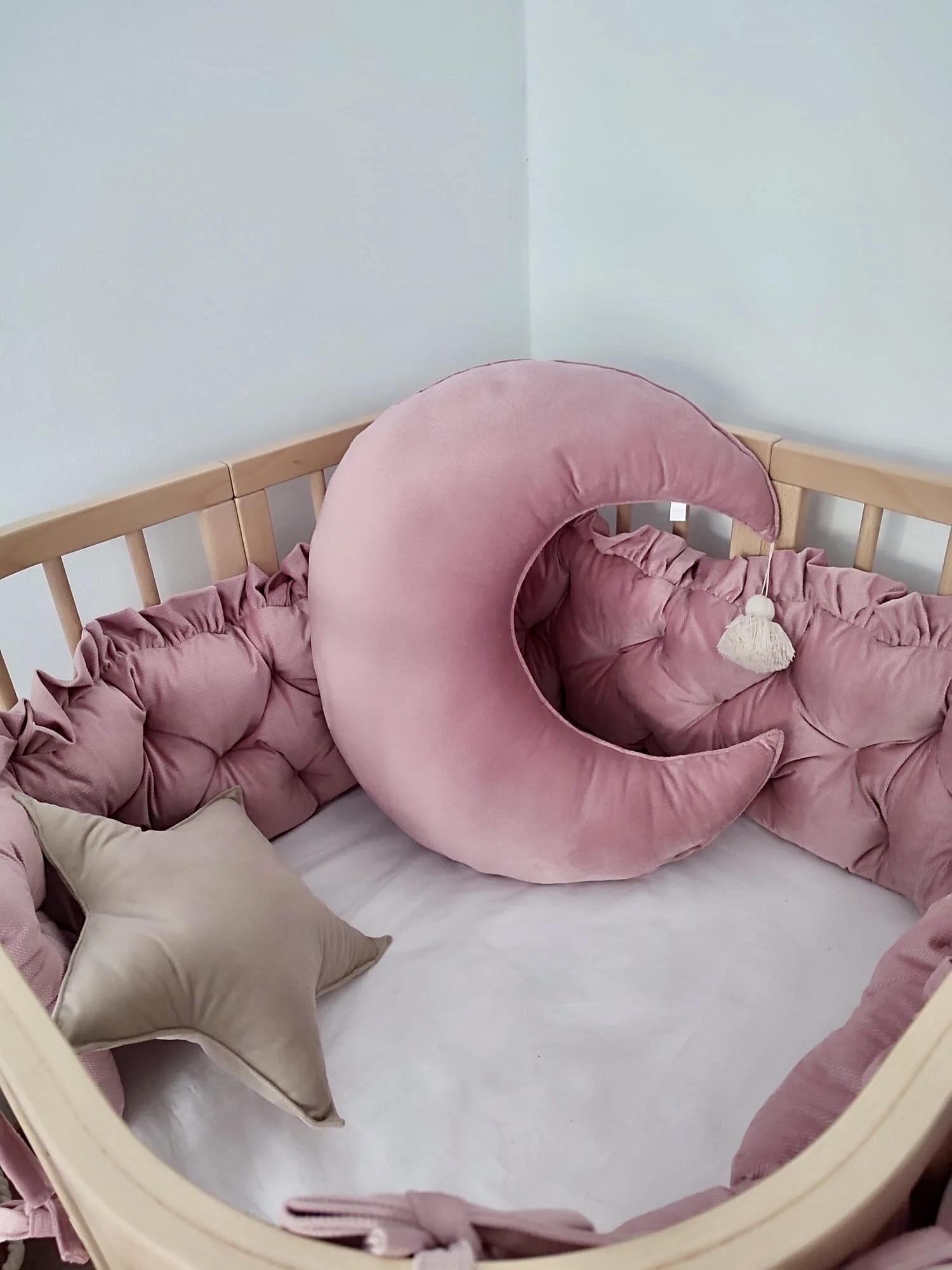 Jedes Kind verdient eine elegante und sanfte Bettumrandung. Unsere Bettumrandung besteht vollständig aus hochwertiger Samt . Diese liebevoll gestaltete Umrandung schafft nicht nur eine behagliche Atmosphäre, sondern bietet auch die perfekte Kulisse für einen ruhigen Babyschlaf.