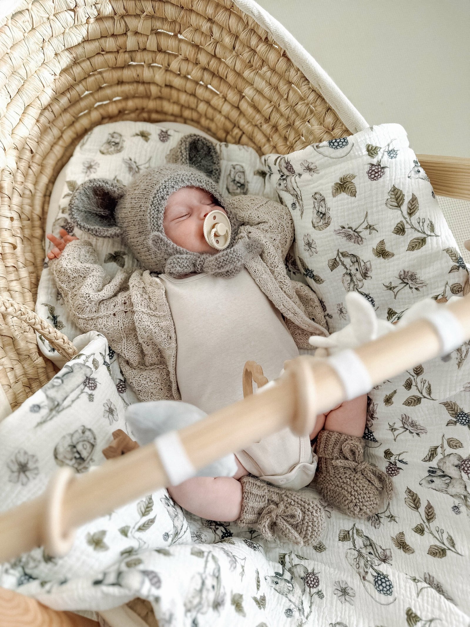 Die gesamte Kollektion besteht aus 100% schadstoffgeprüfter und zertifizierter Ökotex-Musselin Baumwolle. Geeignet für empfindliche Babyhaut.