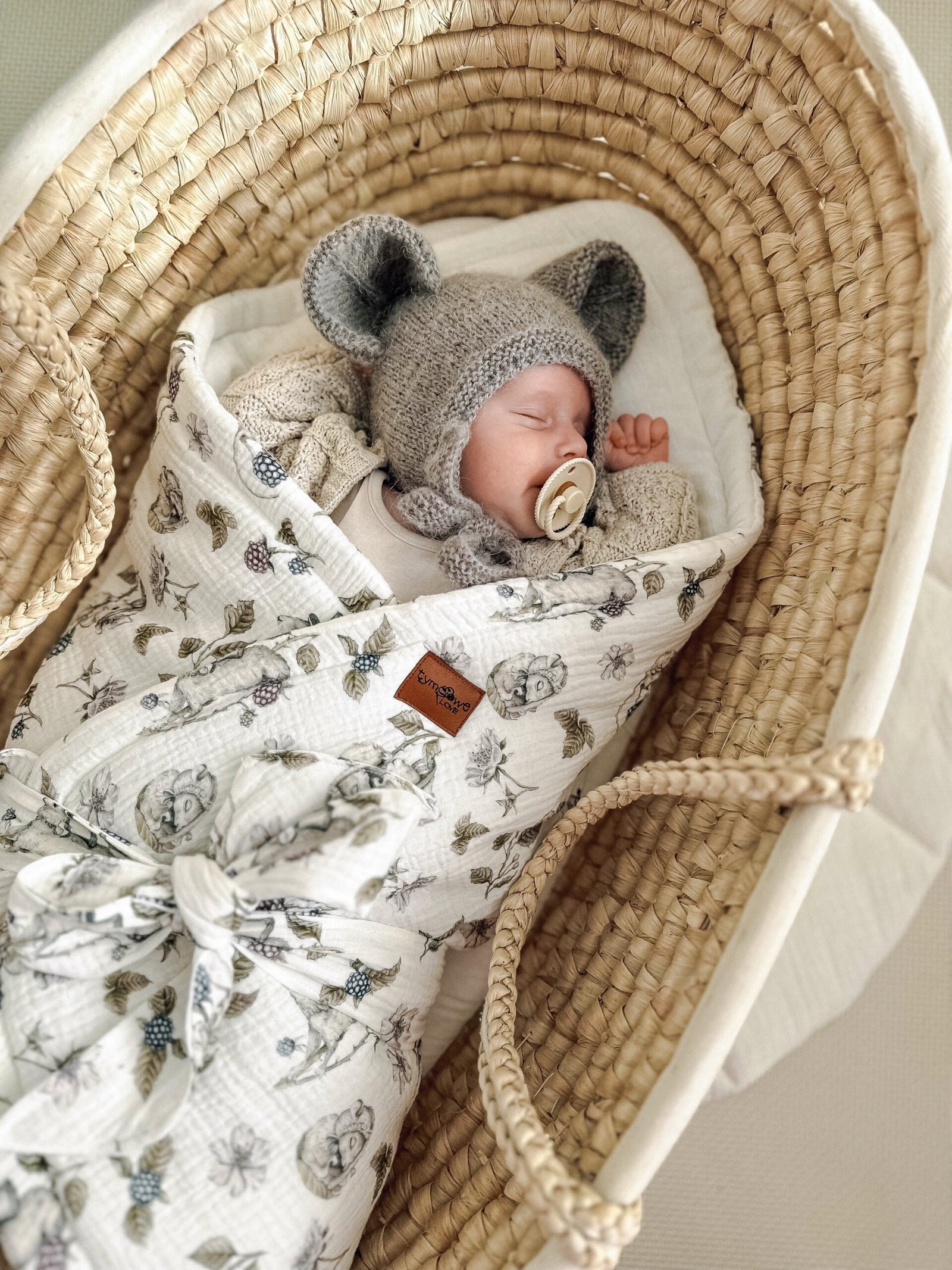 Die Einschlagdecke oder der Pucksack kann als Decke verwendet werden, um Ihr Baby beim Schlafen im Babynest, Kinderwagen, Kinderbett oder Babyschale zu bedecken.